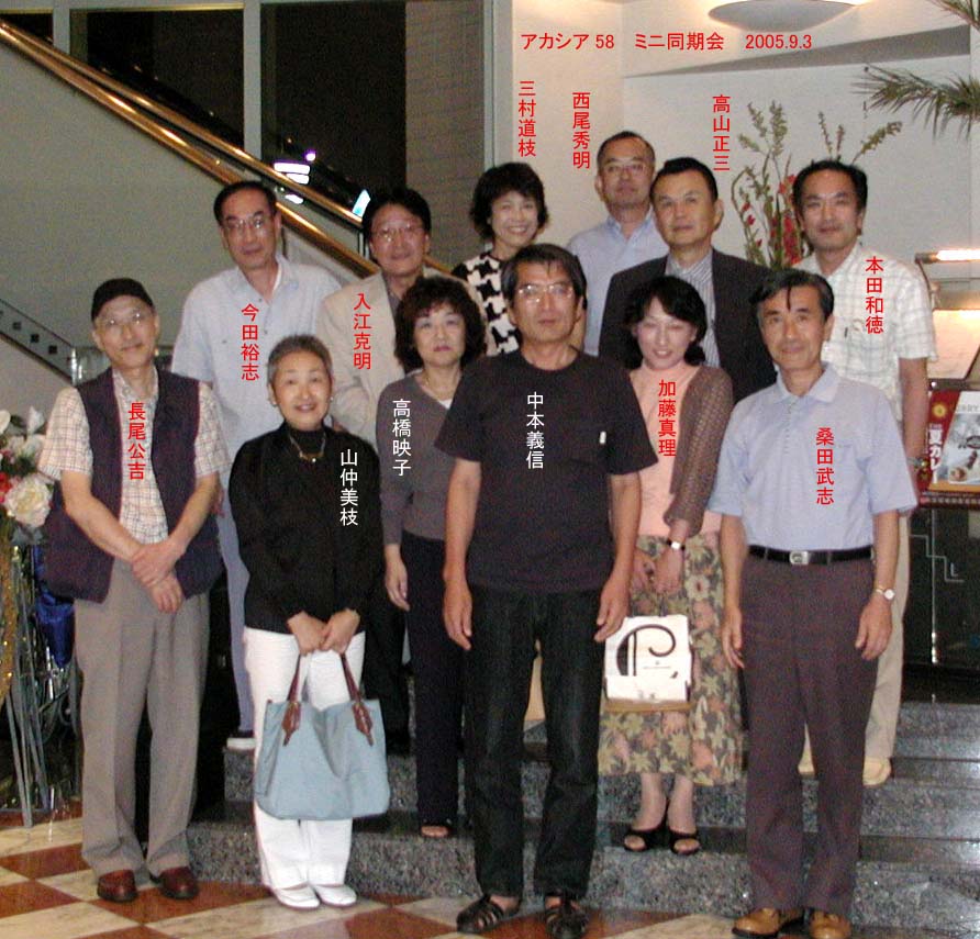 桑田君を囲むミニ同期会 2005/09/03(土) 18:30- 広島東急イン 広島市中区三河町10-1 TEL:082−244−0377 会費:3,500円(サマーバイキング もちろん飲み放題) 昨年は嫁姑問題や介護などの話が多かったのですが、 今年は各自の入院・手術の話題で盛り上がってしまいました、 やはり歳には勝てませんね。