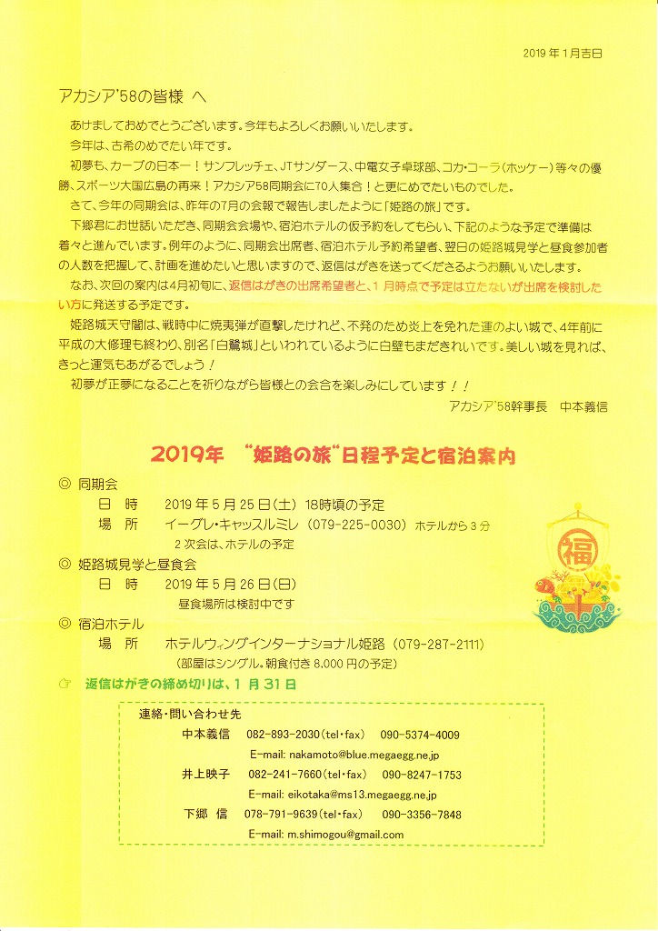5.25(土) ☆同期会 18:00--20:00 イーグレひめじ 4F イーグレ・キャスル「ミレ」