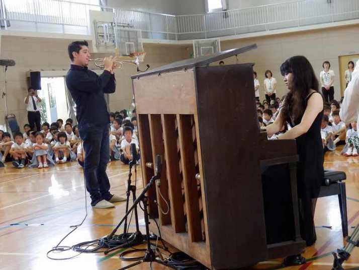 8月6日に小学校で萩原さんに被爆ピアノを弾いてもらい、それを広テレが生中継しました。