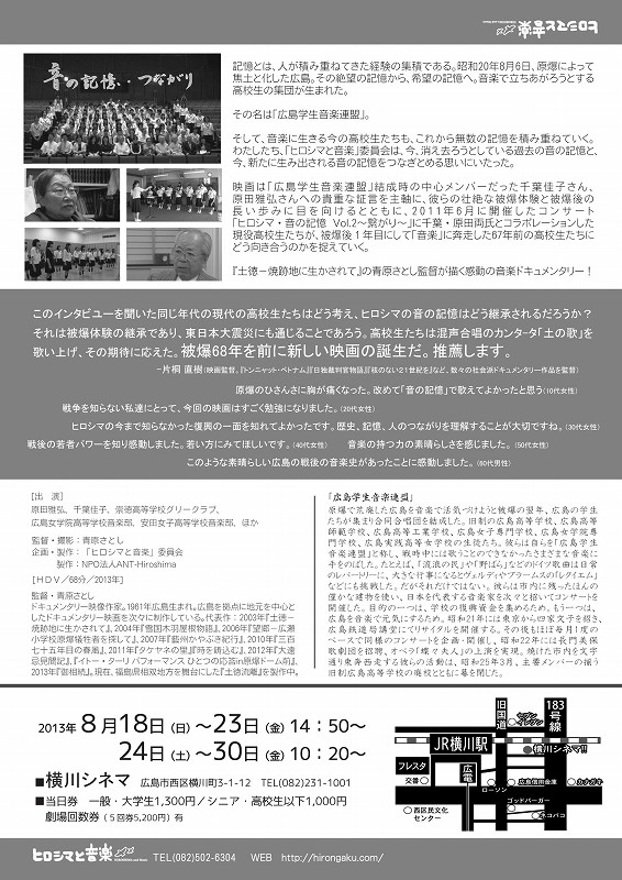 二口さんからのお知らせです。 映画「音の記憶・つながり」のご案内 戦後間もなくの広大附属の講堂が舞台の映画です。 映画上映記事 (中国新聞) 「音の記憶・つながり」 (上映時間68分)@横川シネマ 8月18日〜23日 14時50分〜 24日〜30日 10時20分〜 能登原由美/製作&ナレーションによるドキュメンタリー映画で、彼女は広大で 原爆に関する音楽の収集・研究に携わり、「ヒロシマと音楽」というコンサートシリーズを企画運営。