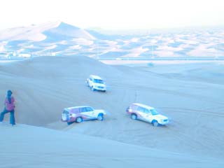 途中の高いところで砂漠に沈む夕日を見るためにストップ。初めて砂漠を歩いて丘の頂上まで行った、といってもほんの10m位。これが大変。砂にめり込み歩けない。折角の革靴がサンドペーパーでこすられたみたい。靴の中は砂が一杯で重い。平らでも歩くのに苦労するのだから、小高い丘の連続の砂漠で水も交通手段も無かったら死ぬのはあたりまえと思った。ランクルを選ぶ理由が分っただろうと運転手が。トヨタはここでランクルを千台単位で売っているはずだと。