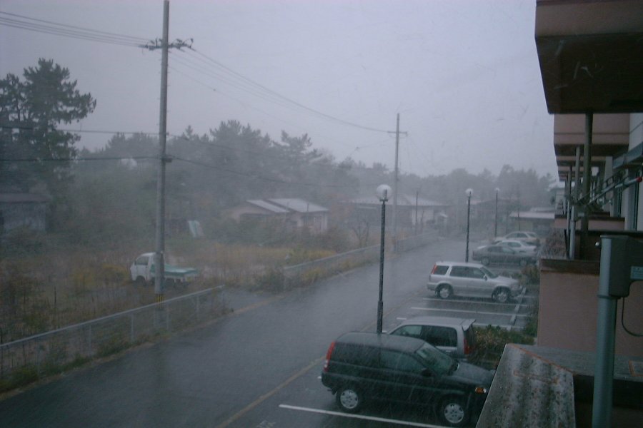 今日までみぞれやひょうが降ったりしてはいましたが、今日から本格的な冬がやってきたようです。北西の強風にのって雪が水平移動している風景も4年目で見慣れているはずなのに、二人で窓から外をながめながら、「お!すごいな」を連発していました。下の写真は今日の午後3時、気温零度、ベランダから撮ったものです。雪の動きがわかりますか。